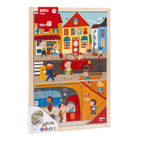 Apli Kids Puzle de Niveles la Ciudad – 254x5x376 mm – 28 Piezas de Madera – Diseño Infantil, Colorido, Claro y Simple – Bolsa de Algodon Organico – Mejora Concentracion, Observacion, Memoria y Resolucion de Problemas
