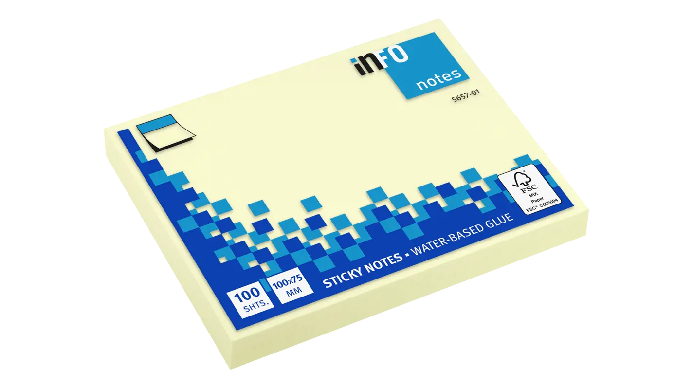 La nota adhesiva amarilla es el artículo más popular en oficinas, escuelas y hogares de todo el mundo. Nuestras notas adhesivas inFO Yellow son ?imprescindibles? desde hace mucho tiempo en cualquier lugar de trabajo. Este práctico producto está disponible en diferentes tamaños para todo tipo de mensajes y en varias opciones de embalaje para cada necesidad.