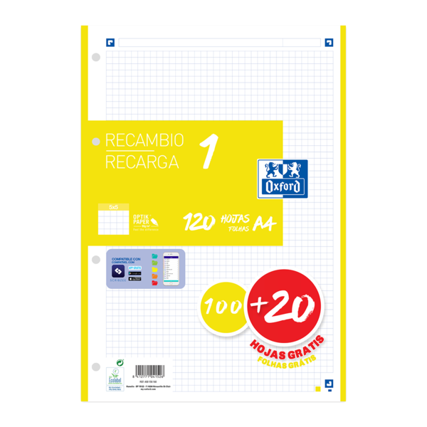 El Oxford School A4 Recambio es un paquete que incluye 100 hojas de papel cuadriculado de 5×5 promocionadas con 20 hojas adicionales. El color de la banda es amarillo y cuenta con la tecnología Scribzee para digitalizar fácilmente tus notas.