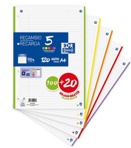 El Oxford School A4 Recambio es un paquete que incluye 5 colores de banda vivos para organizar tus apuntes de forma creativa. Cuenta con 1 línea de promoción para personalizar tus notas. Incluye 100 hojas de papel de alta calidad, además de 20 hojas adicionales. Compatible con la aplicación Scribzee para digitalizar y organizar tus apuntes de forma fácil y rápida.